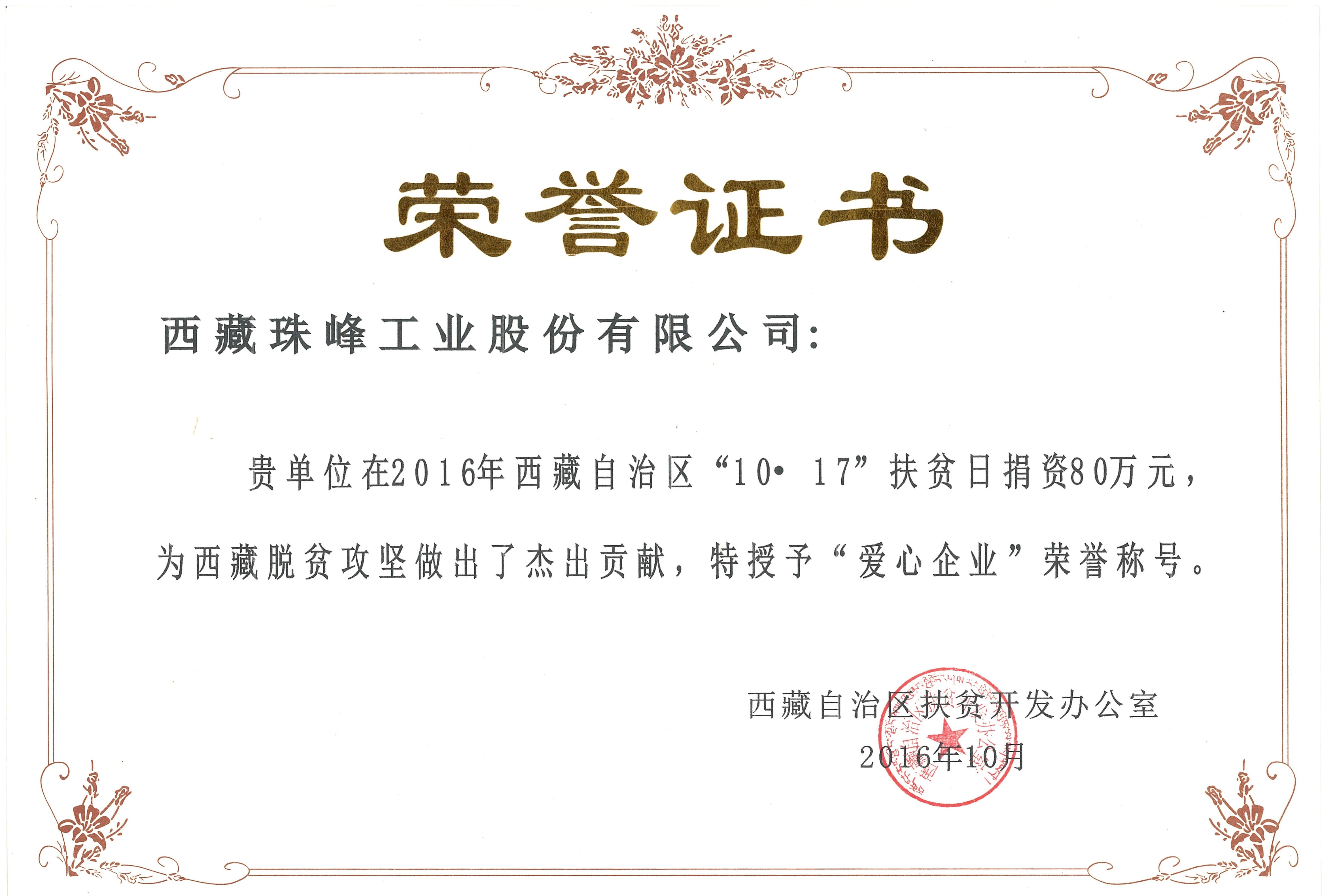 西藏自治區(qū)授予“愛(ài)心企業(yè)”稱號(hào)